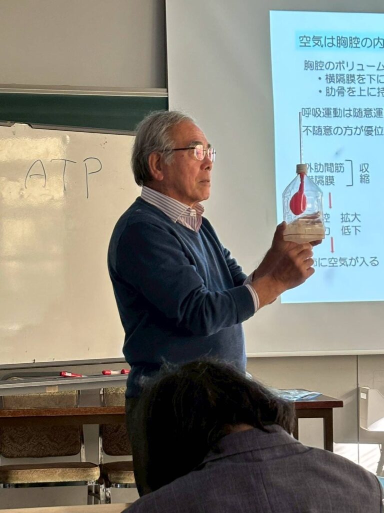 〝息をする〟と〝食べる〟はどう違うか、酸素を運ぶヘモグロビンは生まれる前と後で違いがある事の意味、口から大腸までの消火器系では各部位毎の機能や働きなどを、土井さん手作りの模型を使いながらわかり易く説明していただきました。また。多くの方から活発に質疑も行われ、大変有意義な時間を過ごす事が出来ました。