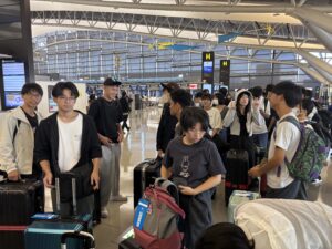 関西空港で出国を待つ生徒たち。7時10分という早朝の集合でしたが、これから始まるベトナムへの旅にわくわくしている様子です。