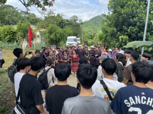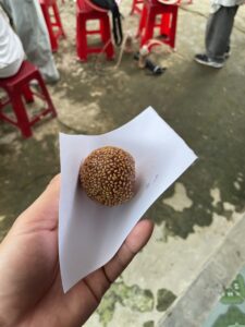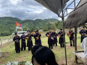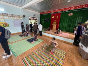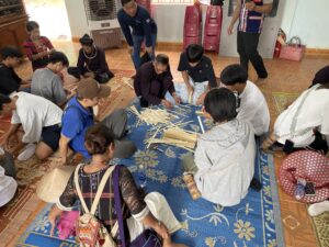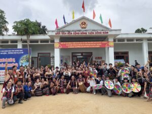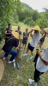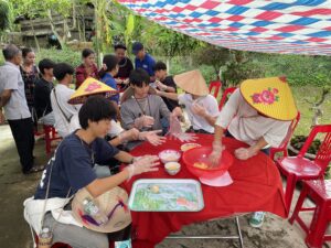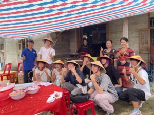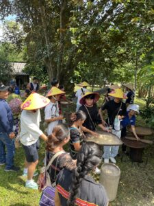 2025.10.10 グローバル教育・地域連携 【行事】修学旅行3日め(カトゥー族訪問) カトゥー族訪問では、伝統的な暮らしの体験や交流を行いました。生徒たちはノンラー(ベトナムの伝統的な笠)をかぶり、普段はできない体験に驚きながらも笑顔になっていました。