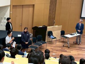 世界で活躍するとは、どういうことなのかイメージできていない中学1年生ですが、赤阪先輩の熱いお話をお聞きして、南河内の地でのびやかに過ごしてきた日々のなかで、夢をもち、好奇心をもって学ぶことが、グローバルでの活躍につながると実感できたと思います。