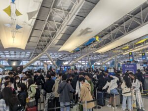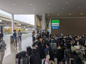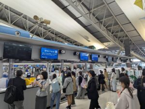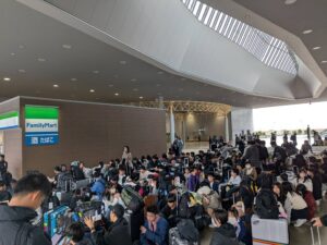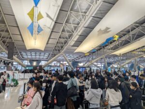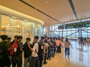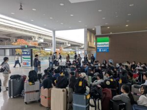 2025.11.05 グローバル教育・地域連携 【中3】グアム修学旅行1日め(1) いよいよ中3最大の行事が始まります。関西空港で8時30分の集合でした。グローバル係が中心となって力の入った出発式をやってくれました。生徒はこれから始まるグアムの旅にわくわくしています。移動後、一人一人チェックインしています。