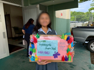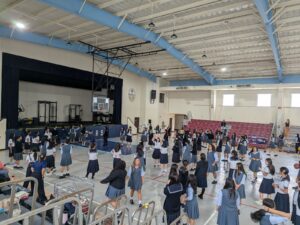 現地の女子校、男子校では、校内見学、授業、セレモニーなど、様々なイベントが用意されていました。午前中は現地校のバディと一緒に授業を受けました。留学に来た感じで、富中生は圧倒されながらも、授業に向き合っていました。頑張るといっぱいお腹が空きます。バディと一緒にランチを頂き、食後の運動を楽しんでいました。じゃんけん列車も始まりました。