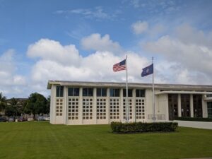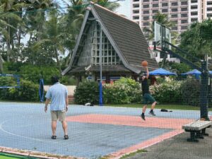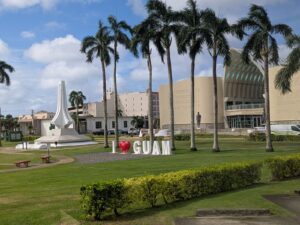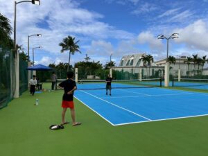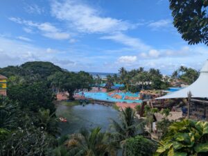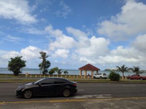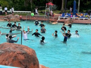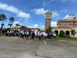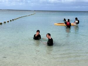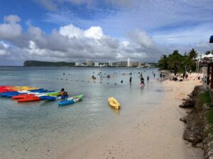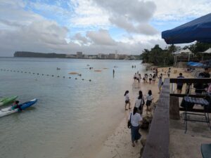 ホテルに戻ってからはBBQまで自由時間です。生徒はプ−ル、浜辺、売店、荷造りなど、班ごとにいろんな活動をします。台風26号の影響で昨日まで小雨でしたが、生徒の熱い思いで帰りのバスの中からグアムらしい青空と青い海を初めて見ることができました。
