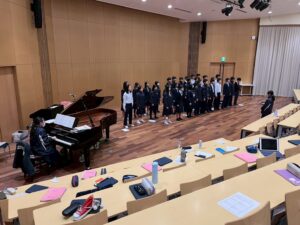 12/5(金)の音楽の授業は、「コーラスコンクールリハーサル inアゴラ」でした。始めはなかなか声が出ていないクラスもありましたが、音楽の先生の指示のもと、後半になるにつれてどんどん良くなっていきました。本番がより一層楽しみになりました♪