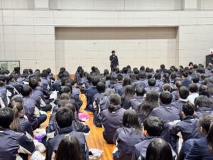 集会の最後には、生徒会長からのお話。全体の前で話をすることはとても緊張したと思います。「おもしろくない話はしたくない!」と生徒会長の思いが詰まった楽しい話をしてくれました。生徒会長の話でみんなが笑顔に(*^^) 常識にとらわれない、自分の考えを話す、時にはとても大切な力ですね。そして、最後には、新年がスタートした心構えをみんなに伝えてくれました。あと3カ月で2年生も修了です。みんなにとって良い3カ月になるように過ごしてきましょう。