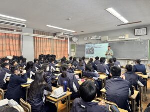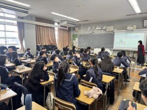 2年生最後の行事になるイングリッシュワールド。初めての泊を伴う研修です。その内容について、具体的に説明しました。2日間、英語のレッスンを受け、英語を使った劇を発表、夜にはレクリエーションの時間もあります。「やったー!」と拍手が起こったり、「えー?!英語しか使ったあかんの?!どうしよー…」と困惑した様子も。ドキドキワクワクしているみんなの声が聞こえてきました。実行委員を中心として、みんなで行事を創りあげてほしいと思います。楽しめるように、これから準備していきましょう!
