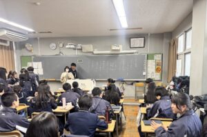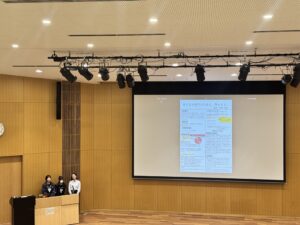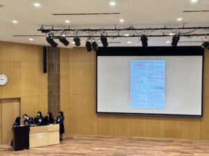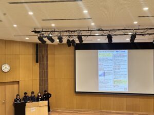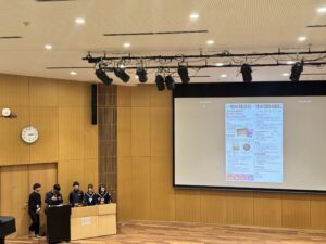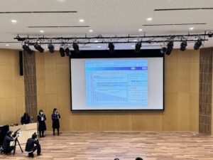 先週と違い、学年全員の前で発表。とても緊張している様子が伝わりました。いざ、発表となるとスイッチを切り替え、グループで立てた問いにつながる質問を導入で行ったり、その企業の魅力を伝えたり、先週の発表を終え、改善点を見直し、さらに分かりやすく相手に伝わるように創意工夫されていました。
