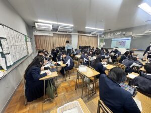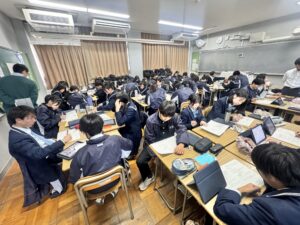 探究学習で取り組んだ成果をクラスで共有しました。まず、班ごとに、自分たちの立てた問いについて、どんな探究を行ったか説明をしました。自分たちの成果について、とても熱心に伝えようと時間を越えてもまだ話したりない様子でした。その後、それぞれが考えた課題は何かを話合い、今の社会に必要なことについて意見を出し合いました。「少子高齢化」「AIが進んでいる」「コミュニケーション不足」「物価高」など現代社会の課題を探究活動を通じて捉えることが出来ていました。中には、「AIを活用しすぎて、考える力を失っている」「文章を書く作業がなくなってコミュニケーションをちゃんと取れなくなっている」と身近な課題を共有している様子もありました。課題解決のために、自分たちができることを考え今後の行動につなげていってほしいと思います。