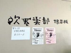 現在、吹奏楽部は連絡用ホワイトボードがなく、廊下の扉に本番予定や練習日程、役割分担等を掲示しています。なんと先日、部員がオリジナルの「吹奏楽部 掲示板」の文字を作ってきてくれました♪