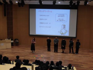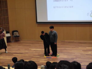 自分と他者との境界線についての内容では、代表として数名の生徒に出てもらい、バウンダリーゲームとして、フラフープを自分のバウンダリー(境界線)に見立て、フラフープ内(境界線内)に他者が入ってきたときにどう感じるか、それは相手によって変化するのかという体験をしてもらいました。見ている生徒たちは、フラフープ内の代表生徒の表情や姿勢に変化があるのかを観察しました。