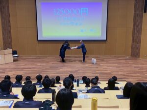 2/28(土)3限は、ネパール募金の贈呈式を行いました。いつもお世話になっている富田先生に、今までの募金活動で集めたお金(文化祭の金券を換金したもの以外)と家庭科で作ったマフラーをお渡ししました。また、富田先生からは7期生に対して感謝状をいただきました。少しでもネパールの子どもたちの助けになりますように!