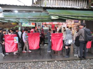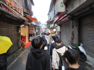 その後、千と千尋の神隠しの舞台となった九份へ向かいました。九份で夕食を食べた後、集合場所を確認して自由散策となりました。九份は雨が多く降る場所で、少しパラパラと雨が降っていましたが、お土産店や出店などを楽しみました。
