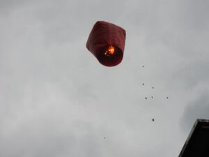 台湾で入国手続きを終えた後、現地ガイドと合流して専用バスにて十份へ移動しました。十份では、天燈上げを行いました。天燈にそれぞれの願い事を墨と筆で書き、願いとともに空へ飛ばしました。