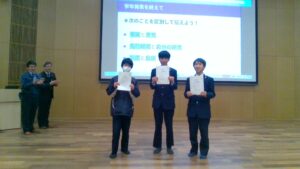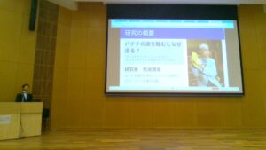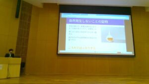 中1最後のイベントとして、理科発表会を実施しました。それぞれ興味のある研究について、自分で調べ、研究を理解し、その研究が自分の生活にいかに密接に関係しているのか、面白いポイントは何かなどをプレゼンテーションしました。全員が各クラスで発表し、そのなかの代表がこの日の学年発表会で発表しました。ノーベル賞やイグノーベル賞をもらった研究をかみ砕いて一生懸命説明する様子は、中学1年生とは思えない堂々としたものでした。